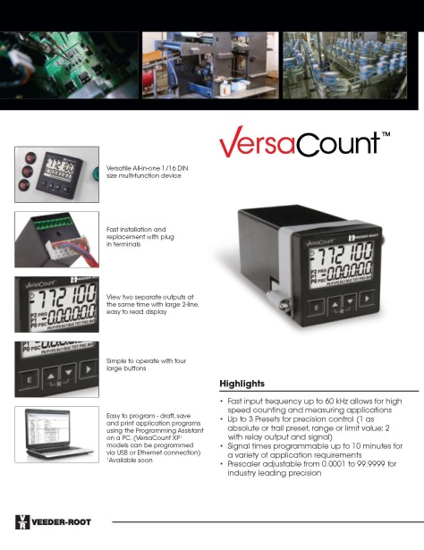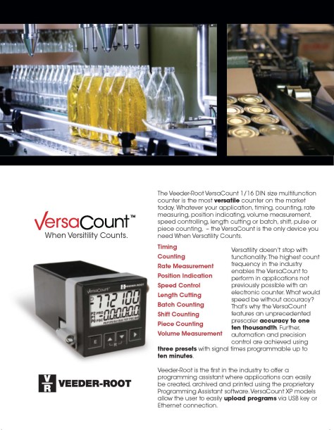 The NEW Veeder Root VersaCount 1/16 DIN size multifunction counter is the most versatile counter on the market today. Whatever your application, timing, counting, rate measuring, position indicating, volume measurement, speed monitoring, length cutting or batch, shift, pulse or piece counting, the VersaCount is the only device you need when versatility counts.