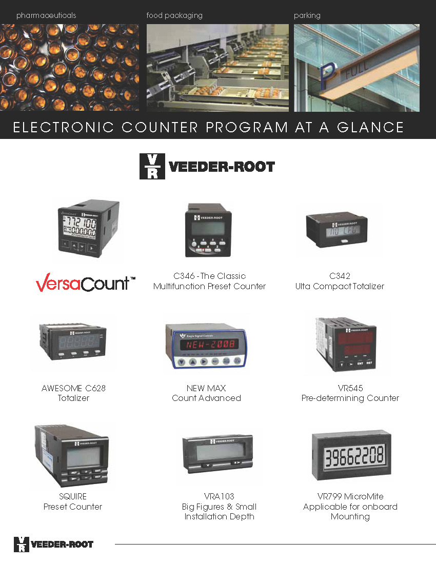 Mechanical Counters: Mechanical Totalizing & Mechanical Predetermining: Rugged, flexible, easy to install Veeder-Root brand, decade wheel driven mechanical counters are highly reliable requiring no wiring, power or input sensors. They are maintenance-free and available in many mount styles designed to never lose count.
